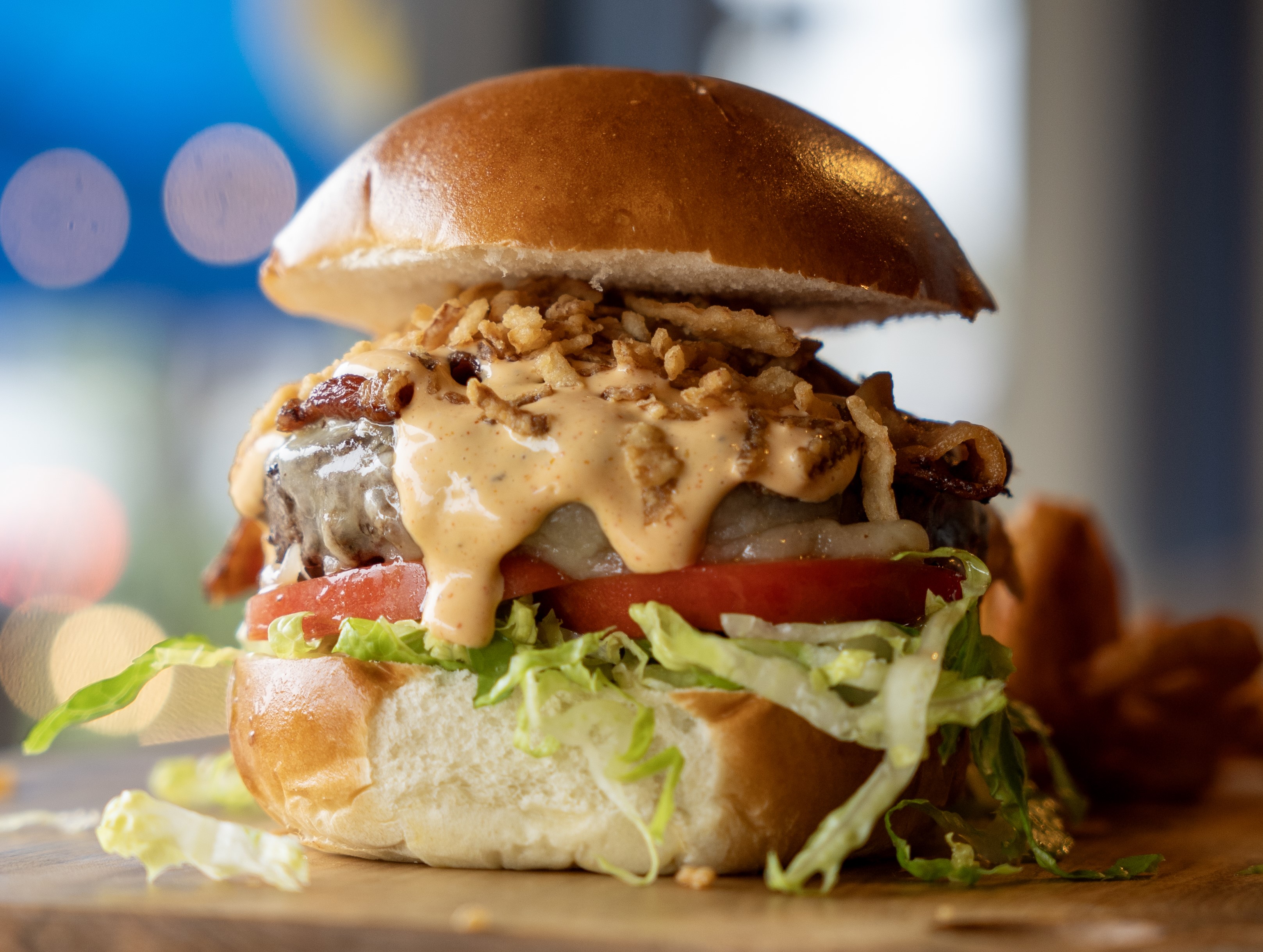 choice of burger, cheddar cheese, spicy kick'n bayou sauce, bacon, lettuce, tomato & crispy onions on a brioche roll w/ fries