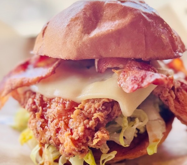 buttermilk fried chicken breast, drizzled with spicy maple syrup, bacon, fontina cheese and lettuce on a grilled brioche bun