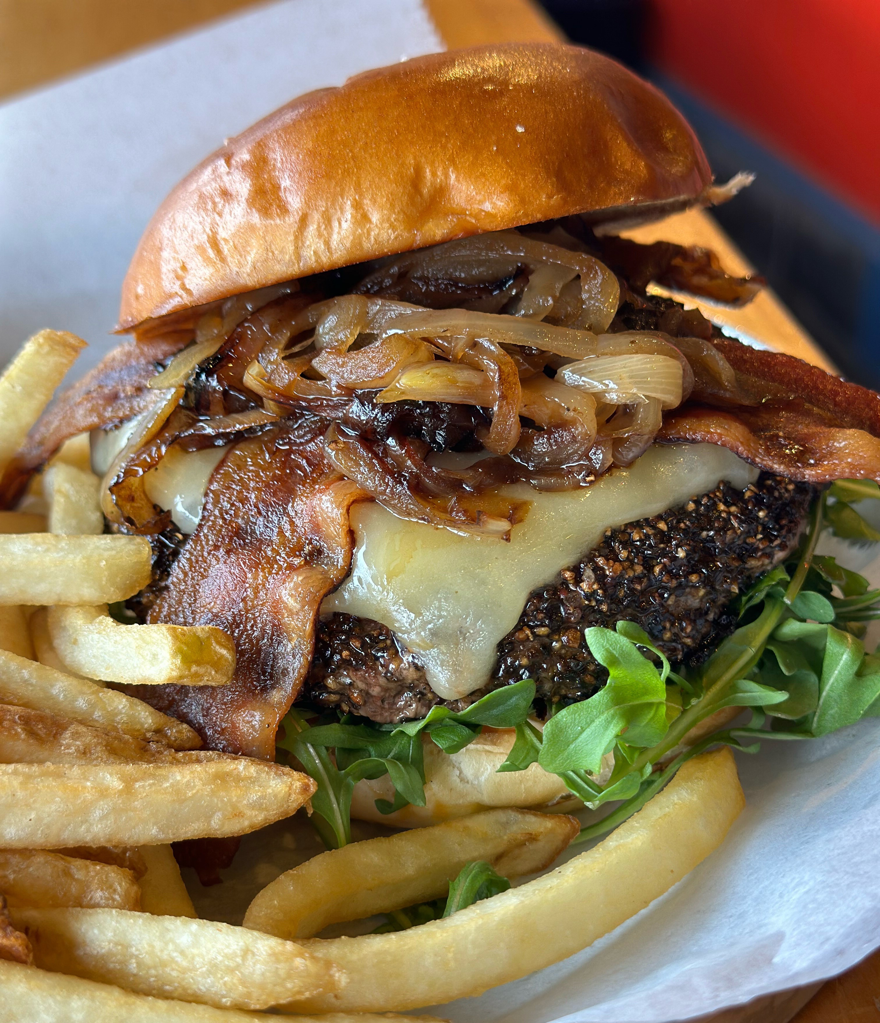 ½lb Angus beef crusted in cracked black pepper, topped with cheddar cheese, bacon, caramelized onions, arugula & garlic aioli on a brioche roll served w/ fries