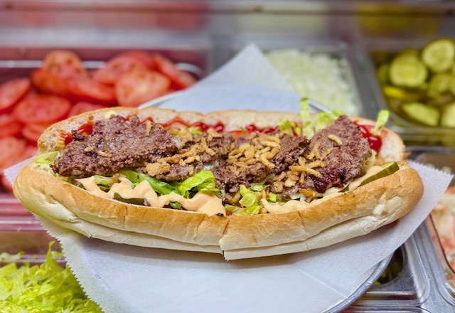 2 ¼ lb burgers, American cheese, sriracha mayo, ketchup, lettuce, tomato, pickles, crispy onions on large sub roll