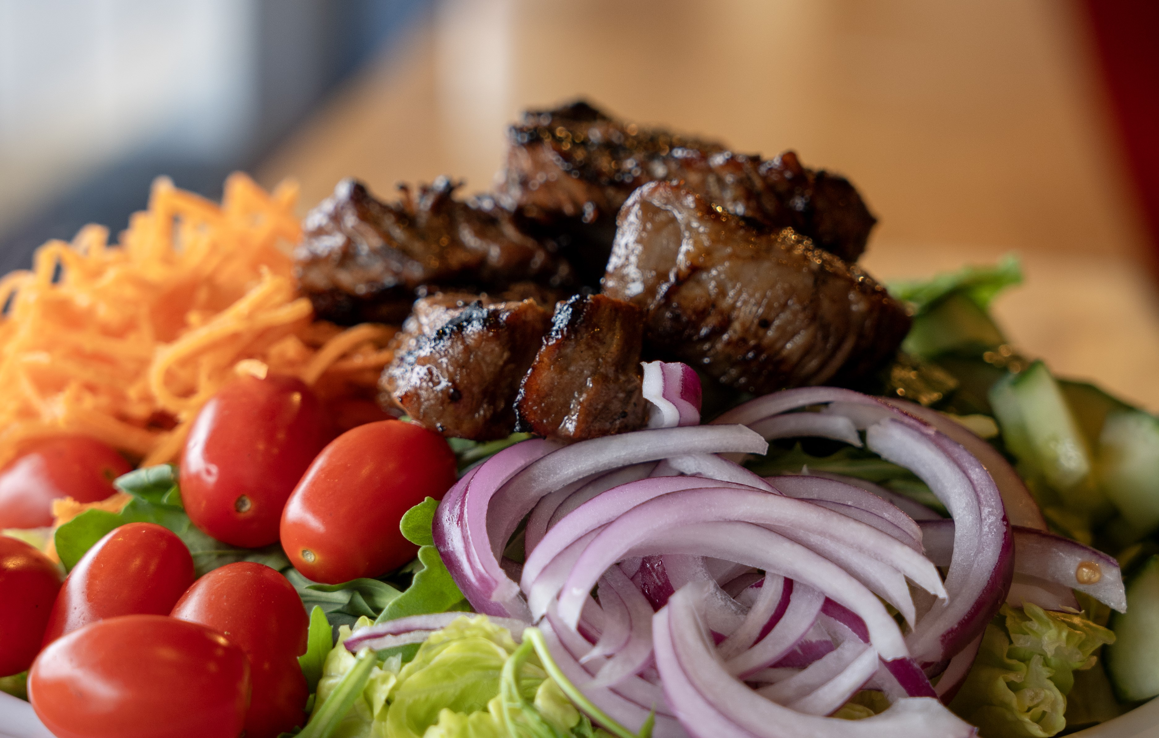 Marinated steak tips over our mixed greens salad with white balsamic vinaigrette