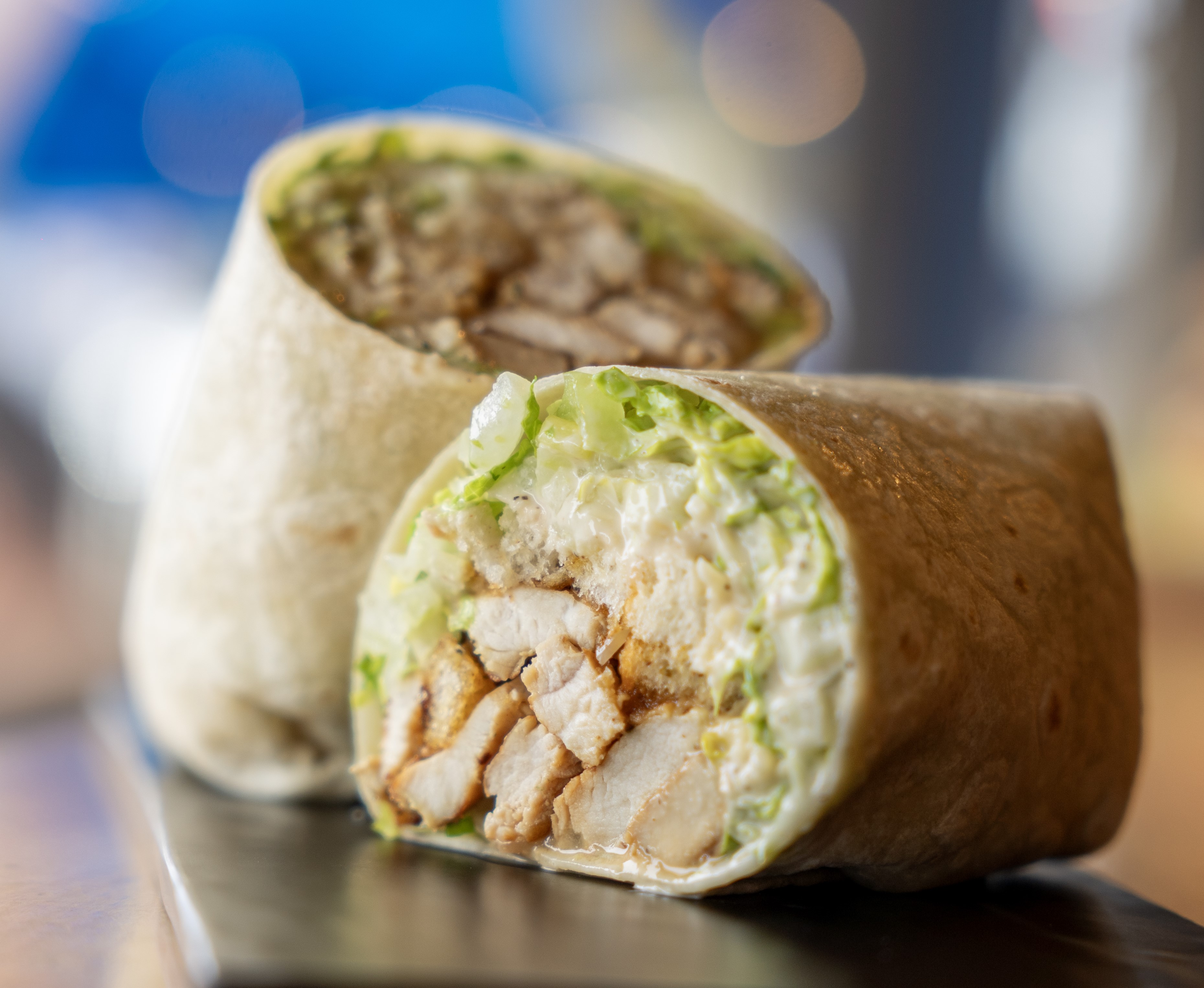 Chicken Caesar wrap: marinated grilled chicken romaine croutons, parmesan cheese & Caesar dressing