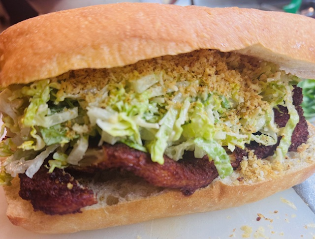 Crispy chicken cutlet, romaine, parmesan cheese tossed in Caesar dressing topped with lemony toasted bread crumbs on a ciabatta roll.