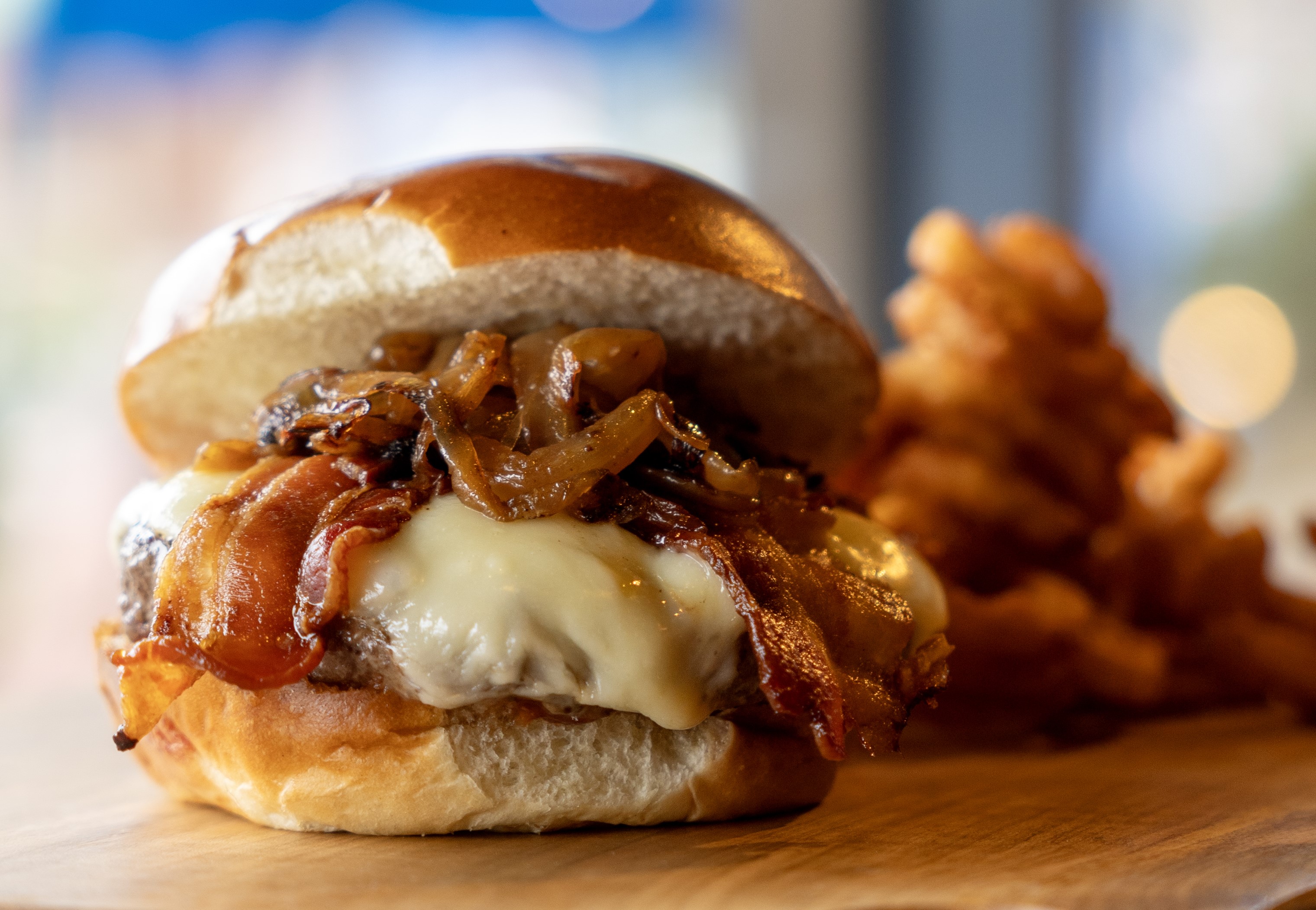BBQ sauce, caramelized onions, bacon, American cheese on a brioche roll w/ fries