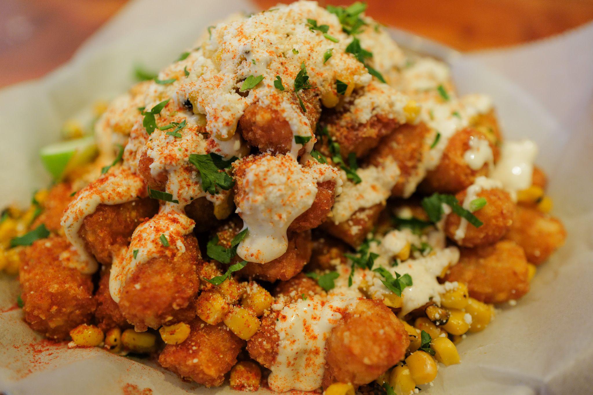 golden fried tater tots topped with roasted corn, cotija cheese, chili lime crema aioli, parsley and smoked paprika
