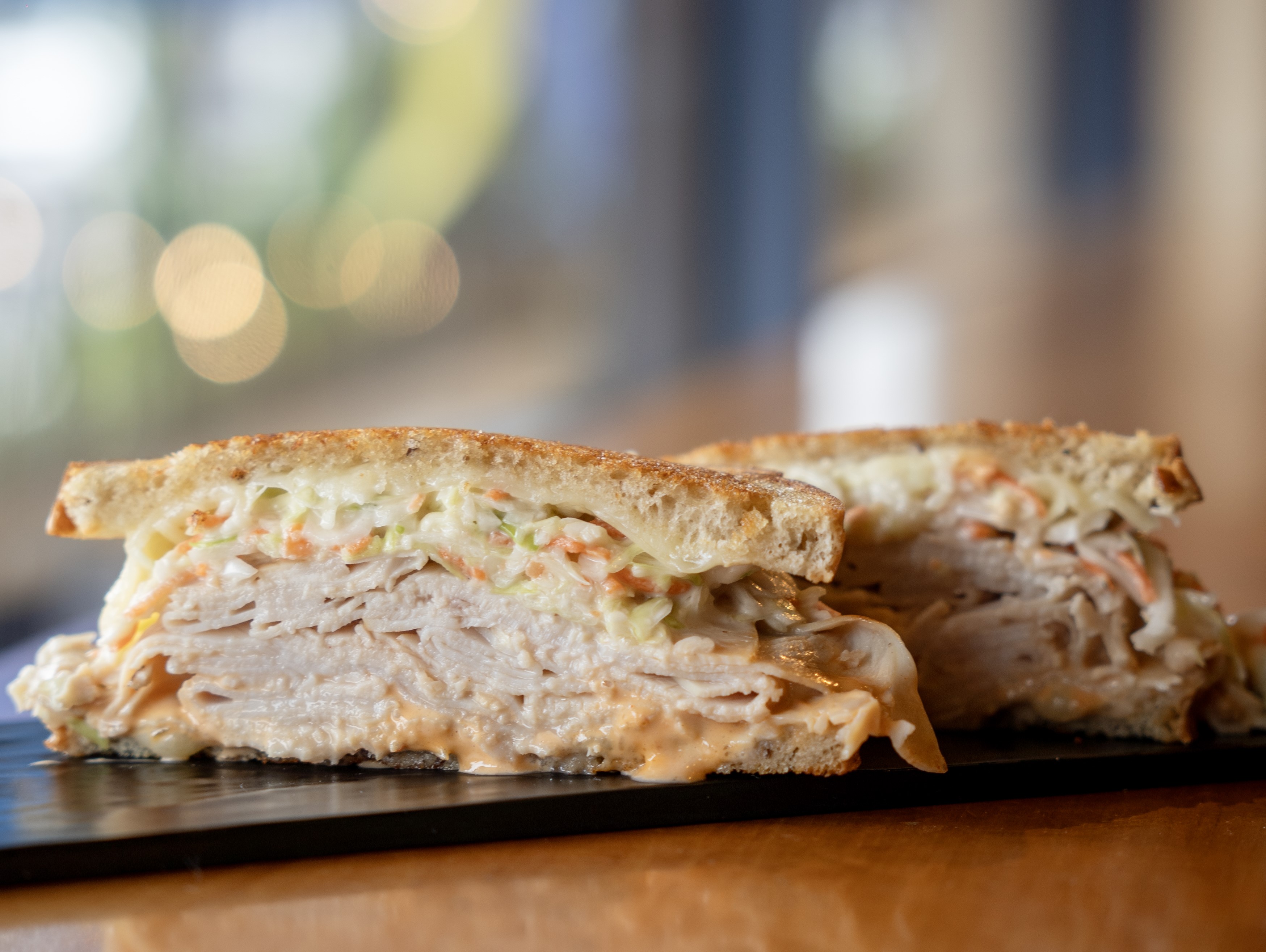 Roasted turkey, Swiss cheese, coleslaw, Russian dressing on grilled rye