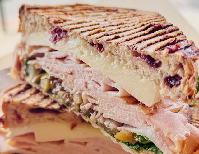 roasted turkey, brie cheese, apple/onion chutney, arugula pressed on cranberry bread