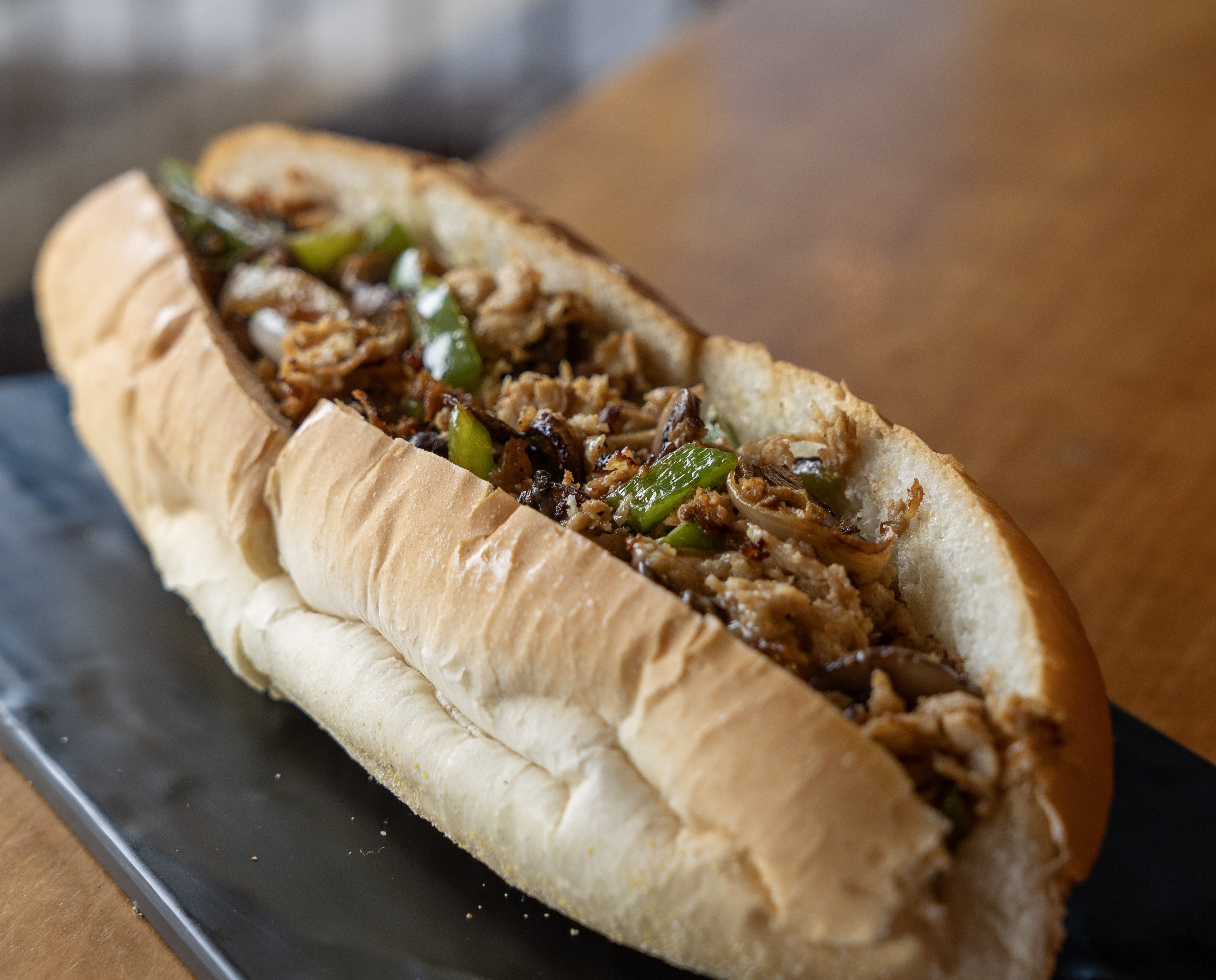 10 oz. of our famous steak tips, peppers, onions & mushrooms, American cheese on a sub roll